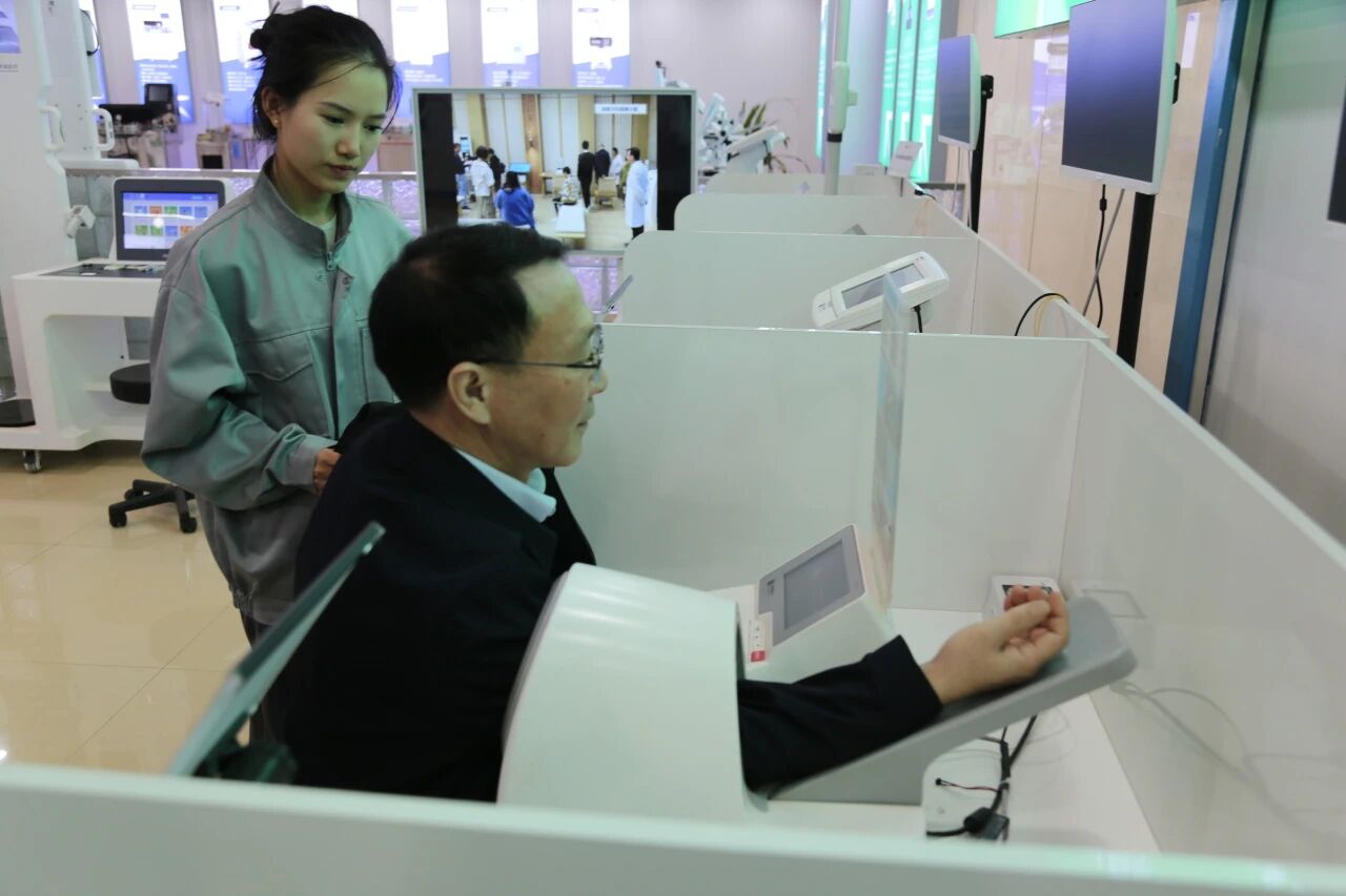 调研组一行对健康管理服务方案的实际应用表现出浓厚兴趣,现场体验了医用电子血压仪、精神压力分析仪等设备。