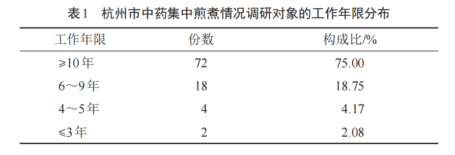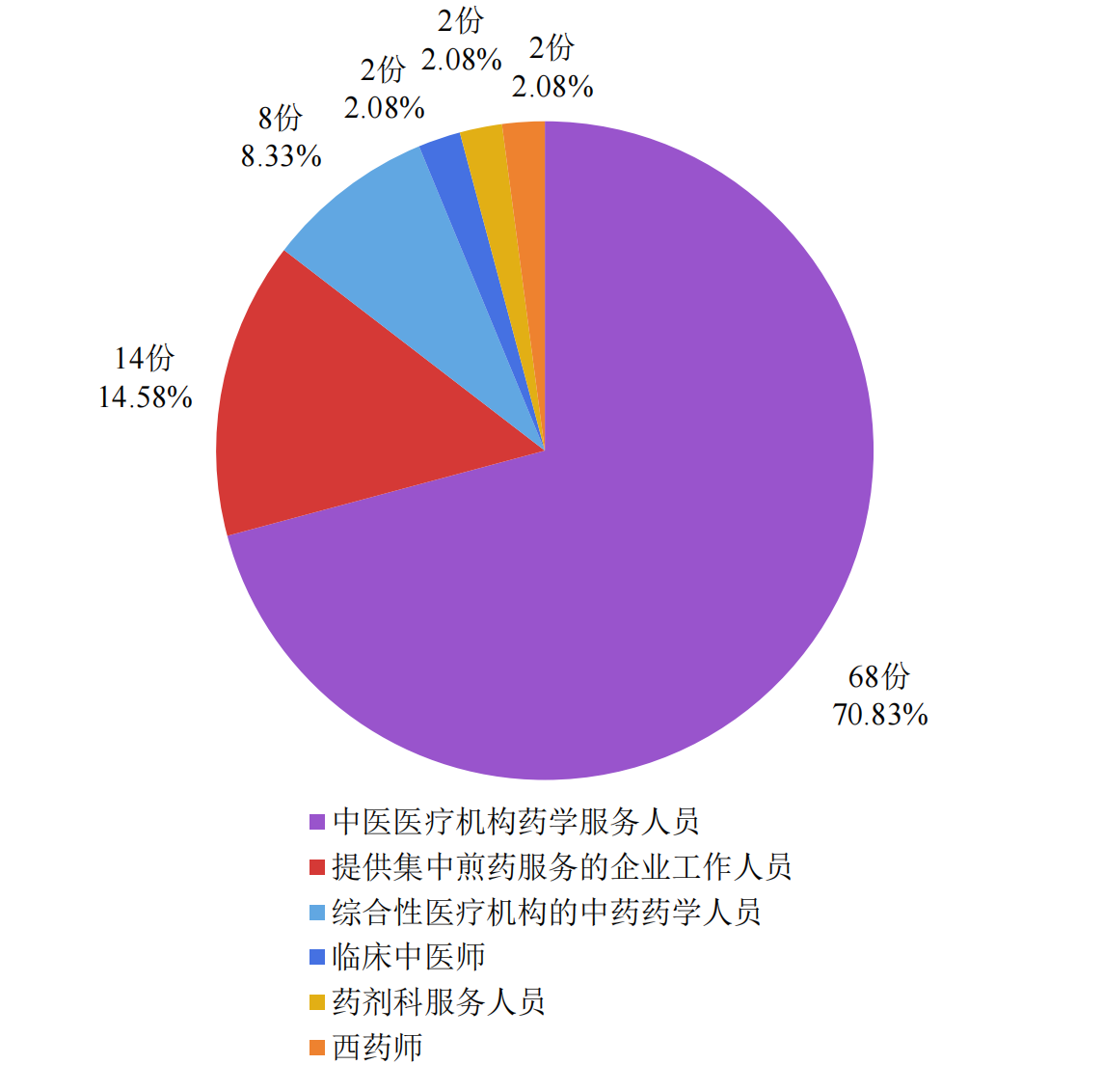 本次调研的样本主要来自基层社区卫生服务中心或卫生院51份(占比57.95%)、医疗机构24份(占比27.27%)和中药集中煎煮企业13份(占比14.77%)。其中,中医医疗机构的药学服务人员占比70.83%,反映出本次调研对象具有较为丰富的工作经验,能够较好地提供有关中药汤剂煎煮与监管的相关认知信息。(见图4、表1)