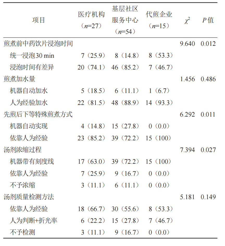 调研结果显示,在煎煮操作方面,不同类型的机构在煎煮前中药饮片浸泡时间、加水量、汤剂浓缩方法等方面存在显著差异(见表2)。