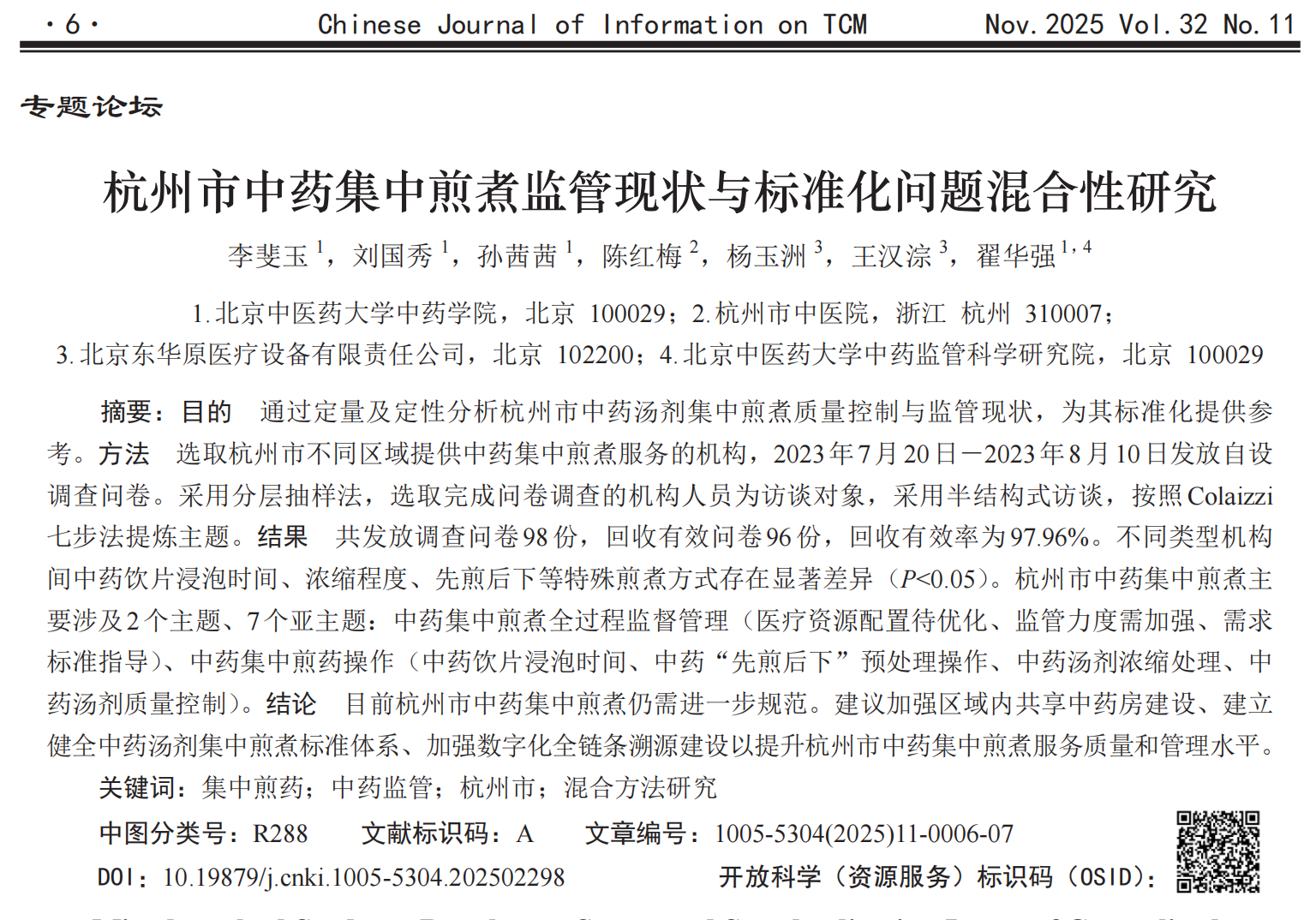 杭州市作为“中国智慧城市”试点城市,率先推行“放心云煎药e平台”,通过数字化监管打通中药煎煮全流程。在此背景下,北京中医药大学翟华强教授团队联合杭州市中医院、杭州唐古信息科技有限公司、北京东华原医疗设备有限责任公司,采用定量与定性结合的混合方法,选取中药集中煎煮产业迅速发展的杭州市,对中药集中煎煮的质量控制与监管现状进行分析,为标准化建设提供依据。