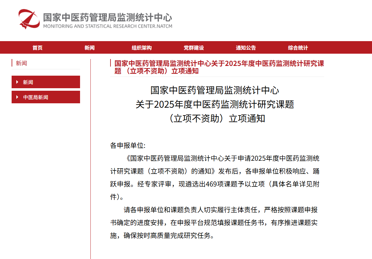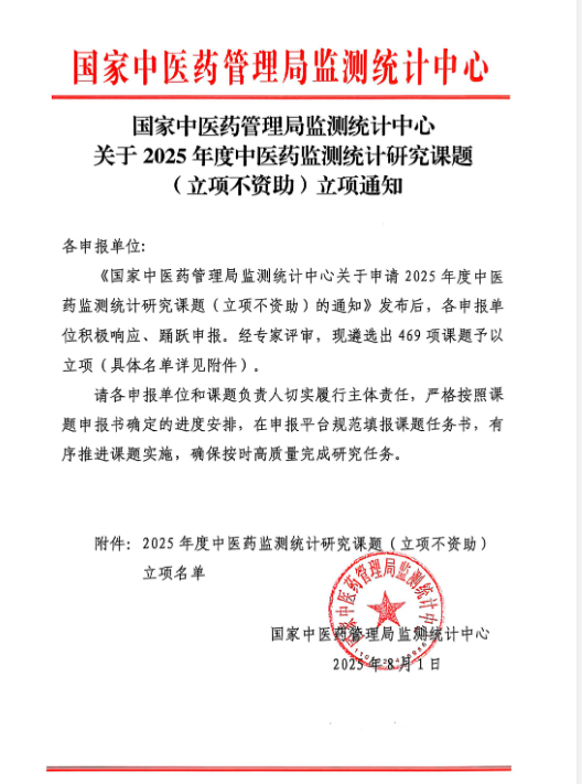 近日,国家中医药管理局监测统计中心发布了《国家中医药管理局监测统计中心关于2025年度中医药监测统计研究课题(立项不资助)立项通知》。东华原申报的4项课题通过审批,成功立项。